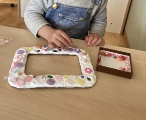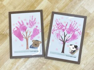 低年齢児さん達は手形と足形の桜の木、高年齢児さん達は写真立て作りに挑戦し、思い出に残る作品が出来上がりました💕