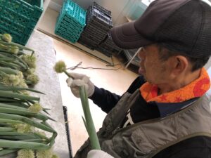 ネギの薄皮や枯れた葉を丁寧にトリミングしています。