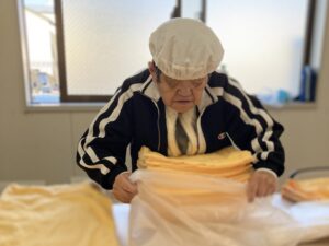 バスタオル、フェイスタオルやハンドタオルの検品・畳み・袋詰めを行っています。